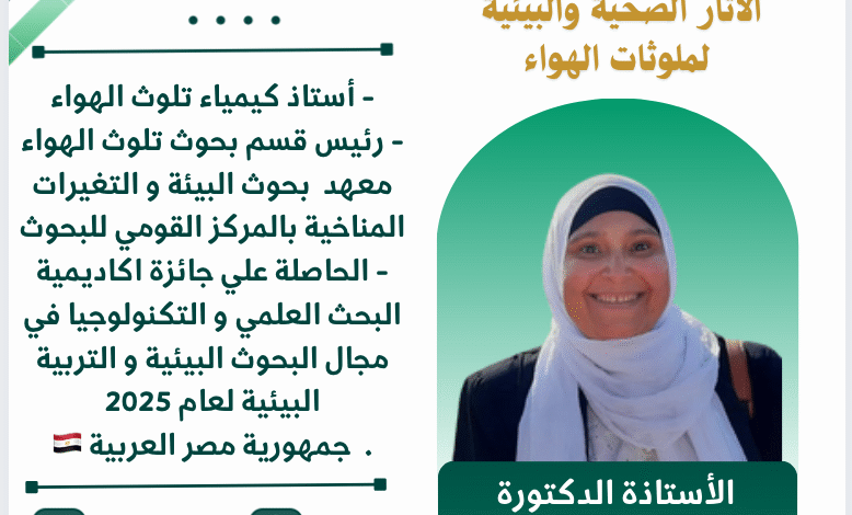 أكمل القراءة »الأستاذة الدكتورة/ سلوي كمال محمد أستاذ كيمياء تلوث الهواء رئيس قسم بحوث تلوث الهواء معهد بحوث البيئة و التغيرات المناخية…