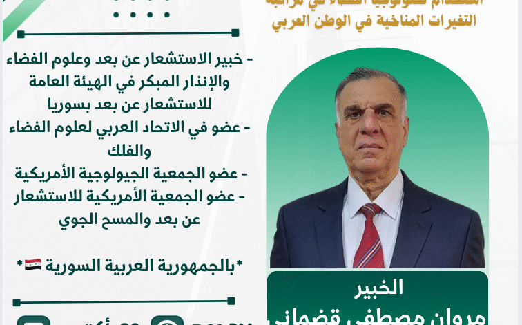 أكمل القراءة »الخبير/ مروان مصطفي قضماني خبير الاستشعار عن بعد وعلوم الفضاء والإنذار المبكر في الهيئة العامة للاستشعار عن بعد بسوريا عضو…