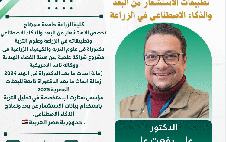 أكمل القراءة »الدكتور/ علي رفعت عليكلية الزراعة جامعة سوهاجتخصص الاستشعار من البعد والذكاء الاصطناعي وتطبيقاته في الزراعة وعلوم التربةدكتوراة في علوم التربة…