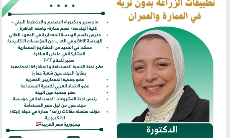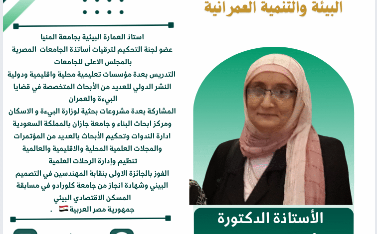 أكمل القراءة »الأستاذة الدكتورة/ أمال الدبركياستاذ العمارة البيئية بجامعة المنياعضو لجنة التحكيم لترقيات أساتذة الجامعات المصرية بالمجلس الاعلى للجامعاتالتدريس بعدة مؤسسات تعليمية…